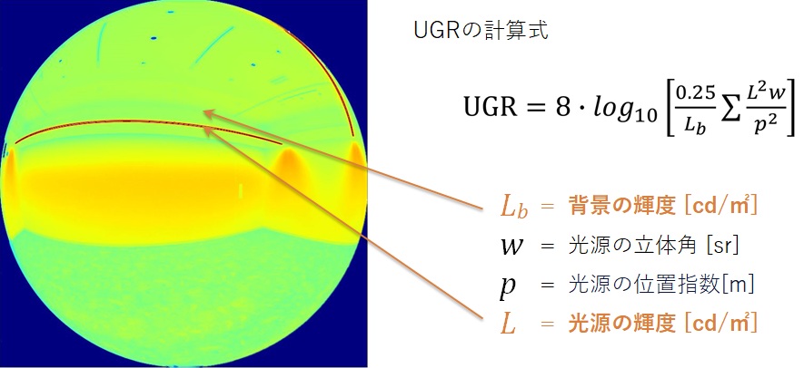 グレアとは、光源や反射面が過度に明るく見えることで生じる不快感や、視認性の低下を指す。屋内空間のグレアは、UGR(Unified Glare Rating)と呼ばれる指標によって数値化されており、UGRの計算には、光源や背景の輝度が用いられる。