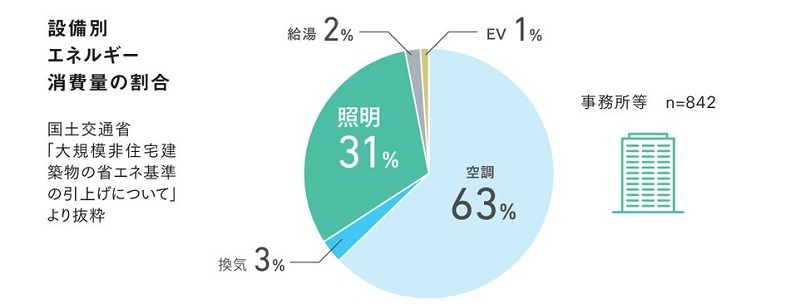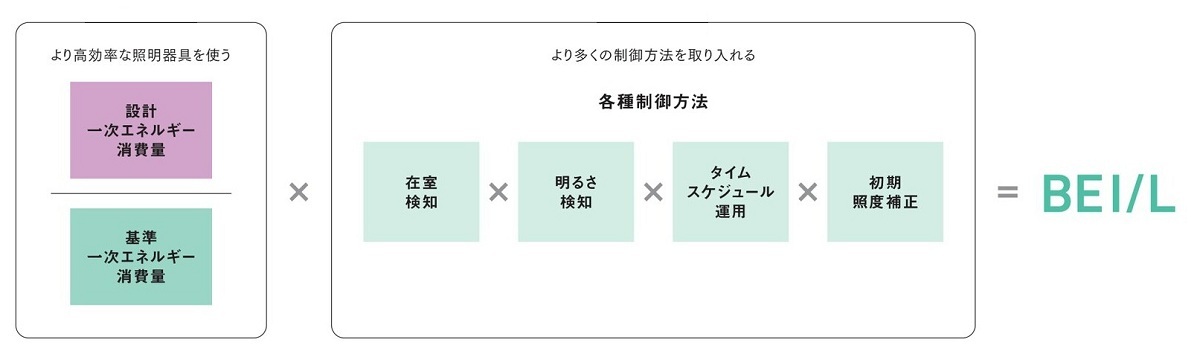 BEIは、空調・換気・給湯・照明など、建物全体の設備エネルギーを合算して算出されるが、そのなかでも、照明に関するエネルギー消費を示す照明BEI(BEI/L)は、建物全体のBEIに与える影響が小さくない。