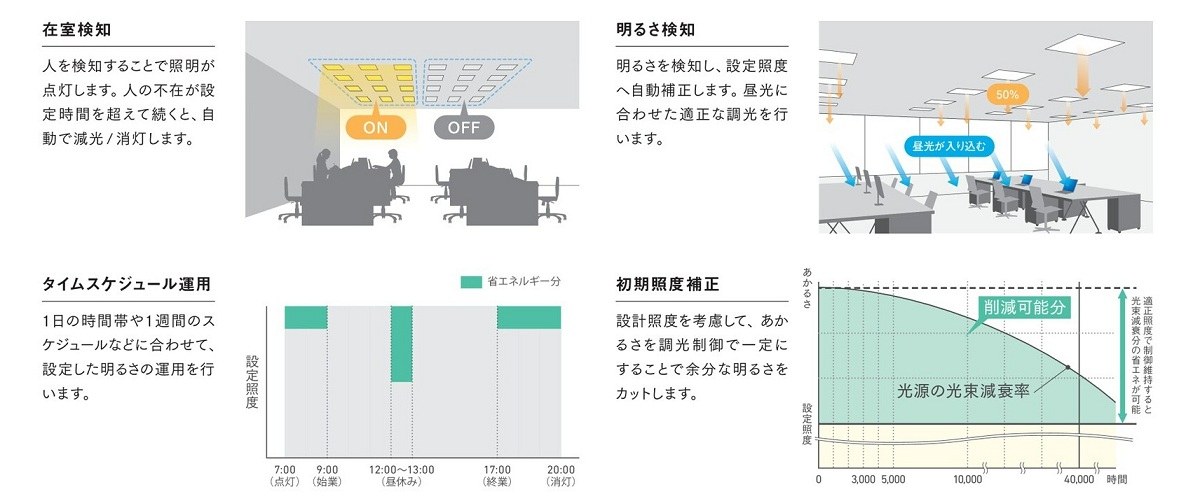 - 明るさ検知による設定照度への自動補正