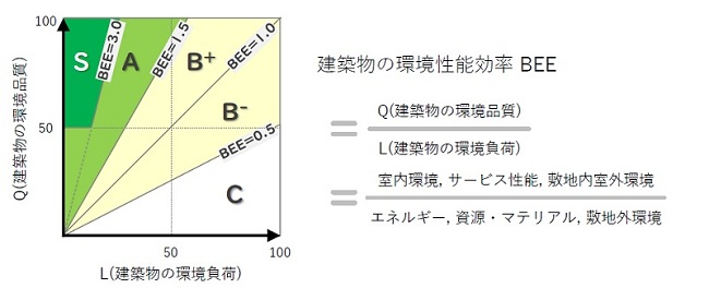 評価にあたっては、建築物の環境品質(Q)と環境負荷(L)をもとに、建築物の環境性能効率を示す指標BEE(Built Environment Efficiency)が用いられており、省エネ性能については、前述したBEIを活用した評価も行われている。