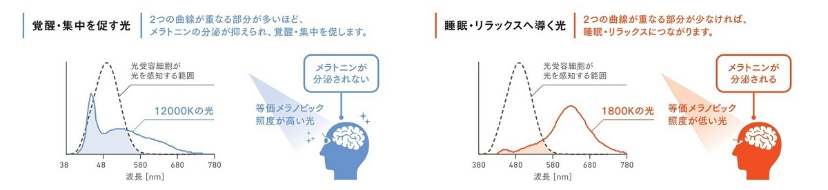 *等価メラノピック照度:体内リズムに影響する光受容細胞(ipRGC)が感じる明るさを表した単位。午前中は等価メラノピック照度が高い光、16時以降は等価メラノピック照度が低い光にすることで、生体リズムの調整に寄与すると考えられる。