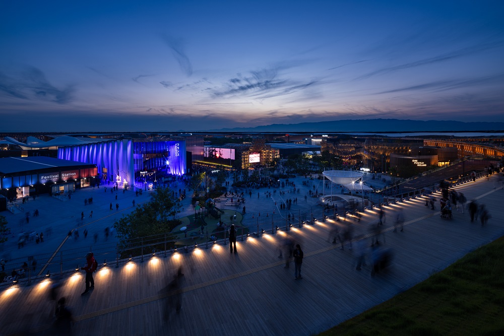 大阪・関西万博の大屋根リングから会場を見る。スカイウォーク(写真手前)の通路脇に、薄明視のモードを意識した淡い光が現れ始めている。「最初は弱い光だと感じるかもしれませんが、空の光がゆっくりと暗くなっていく中で、徐々に存在感を増し、『いいじゃない』っていうふうに感じ方が変わる面白い時間帯なんです」(写真:AKITO GOTO)