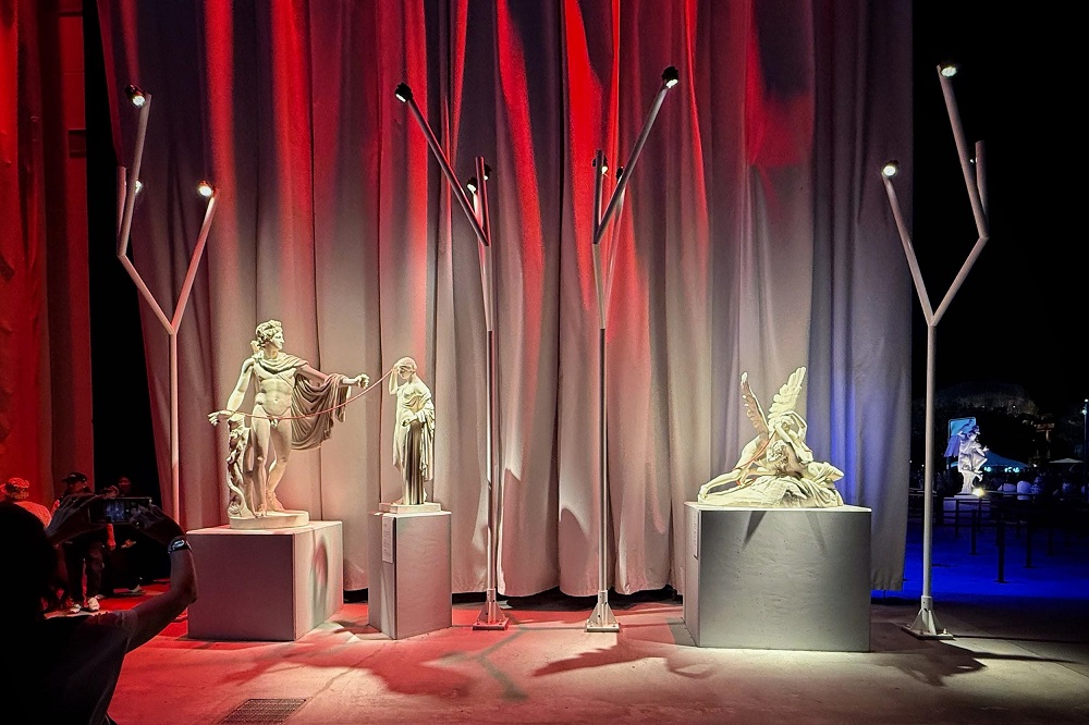 万博フランス館の前に設置された彫像用の照明。フランス館全体の照明デザインだけでなく、屋外彫刻のための細部にまで配慮された美しい照明デザインは、ガイドラインに沿いながら各国が独自に工夫した好例の一つとして東海林さんが挙げている(写真:ヒカリイク)