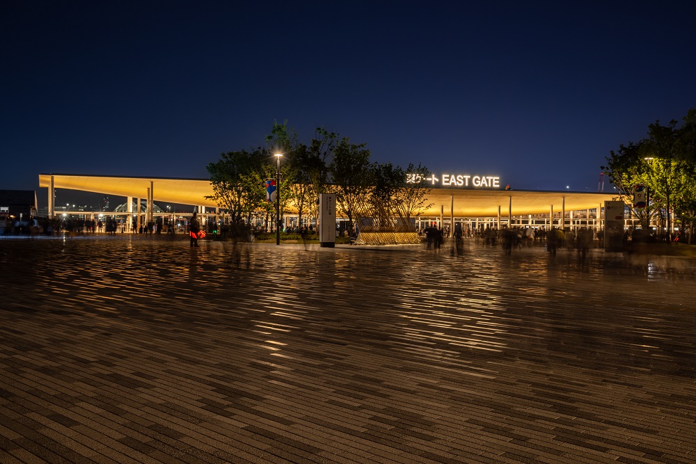 東海林さんによれば、大屋根リング以外では、東ゲートを入ったところにある広場で夜の美しい光を体験できるという。「ツヤの有無で表情の異なる路面のタイルの貼り分けは、ランドスケープをディレクションした忽那さんのアイデアです。夜になるとツヤのあるタイルに周囲の輝度が映り込み、さざ波に映る光のような景色が広がる。僕が気に入っている光景の一つです」
