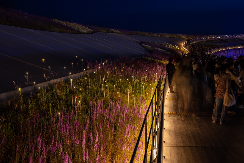 大阪・関西万博会場の大屋根リング。スカイウォーク上に設置された「イルミ草」(写真左手、全体では約500本)は、来場者の人気を博している光のアイテムだ。小型のソーラーチャージシステムを用い、数十本単位で自己点灯する仕組みになっている(写真:AKITO GOTO)