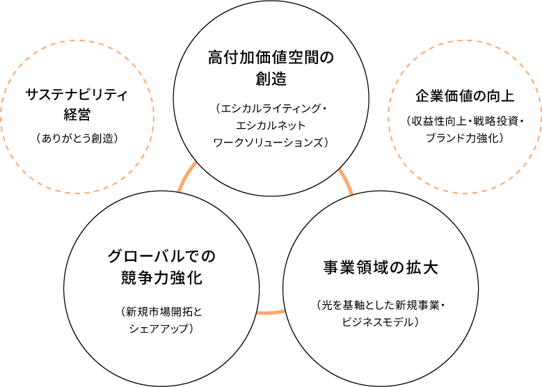 本中期経営計画期間では「主力事業での持続的な成長」と中長期的な成長実現のための「光を基軸とした新規ビジネスモデル」の立ち上げに注力します。