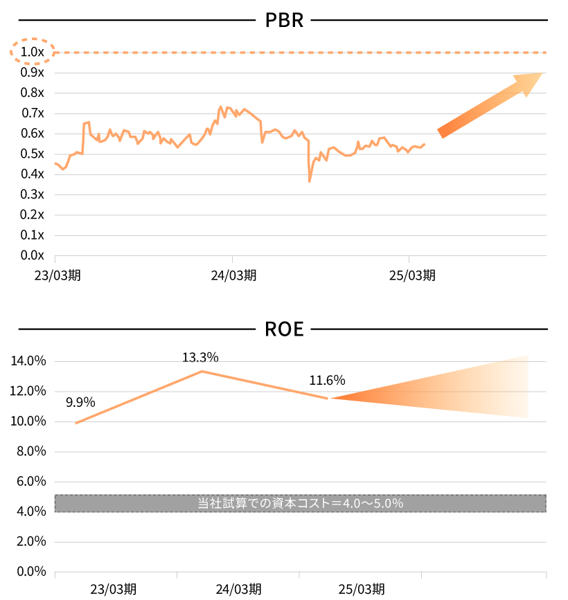 これまでPBR1倍割れの状態が継続しておりました。本中期経営計画期間では、着実な事業成長の実現により利益創出するとともに、「連結収益力の強化」と「在庫適正化(SCM強化 / PSI精度向上)」を主たる改善課題として、資本効率向上のための取り組みを強化いたします。