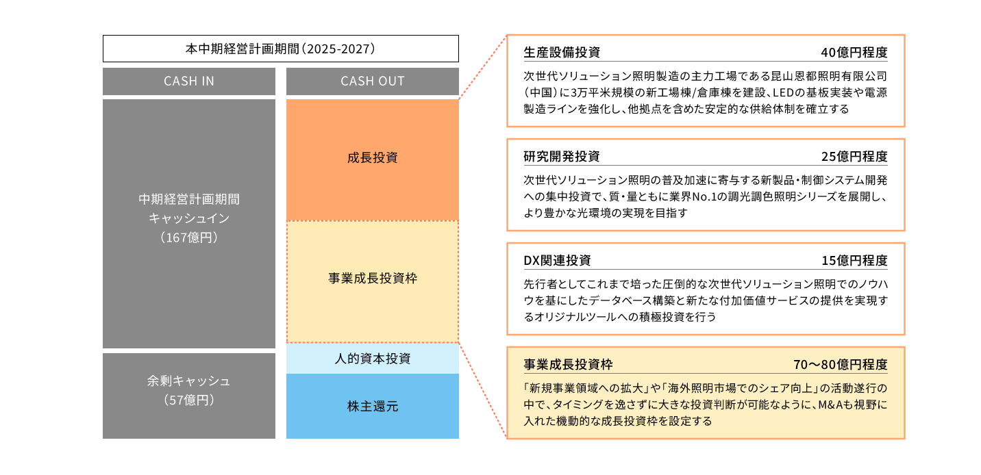 事業成長の根幹となる新たな照明ソリューションの創造を実現する人材・組織づくりの強化のための制度変更や積極投資を行う