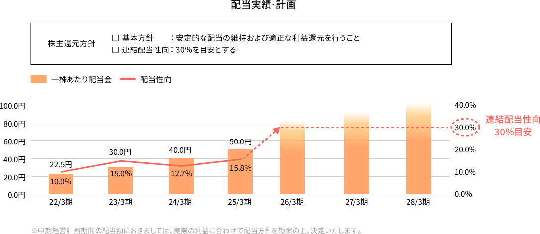 株主還元は連結配当性向30%を目安に、安定的かつ継続的な配当額の向上につとめます。また、各年度における中長期的な成長投資の進捗状況および業績の伸展にあわせ、配当額を検討いたします。