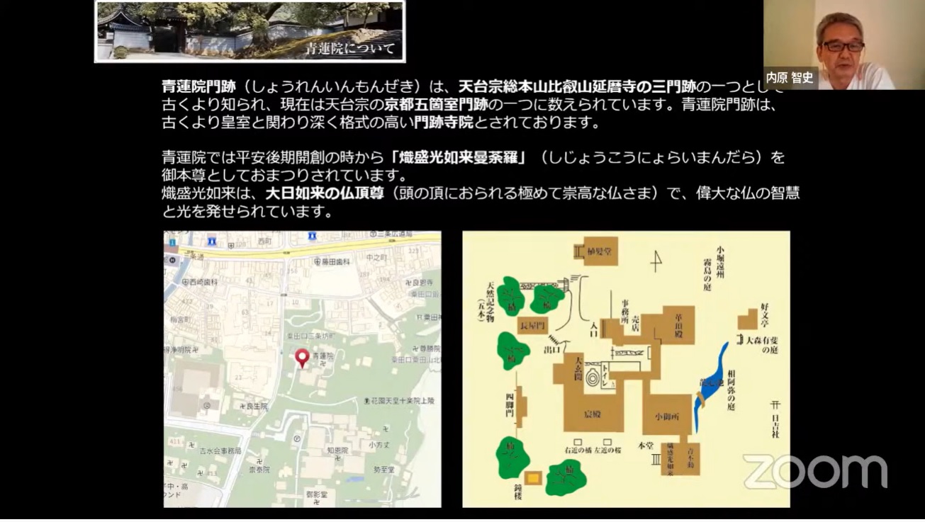 「ご門主は、光に対して非常に思い入れの強いお方で、我々が他に企画しているイベントにも登場いただいたりしております。青蓮院っていうのは、比叡山の延暦寺の京都市中にある三門跡寺院の一角を担っていて、広く市民に教えを広げる為の非常に重要な役割を担っているんです。天台宗の中でも本堂が熾盛光如来で、この熾盛光という字を見ていただいても分かるんですが、非常に光に縁のある、大日如来様自体もそうですけれども、その頂きというか、頭の上のてっぺんの一番中心におられるのが熾盛光ということで、 光を身に纏って自ら発光しているような存在で、人々に光を与えるような、そういう仏様なんです。場所は京都の東山で知恩院とか有名なんですが、いわゆる祇園の四条通りより少し北側にある、是非一度足を運んでいただければと思います。建物自体はこういうふうな形で、今回全体に関わる部分のLEDの改修ということになりました。」
