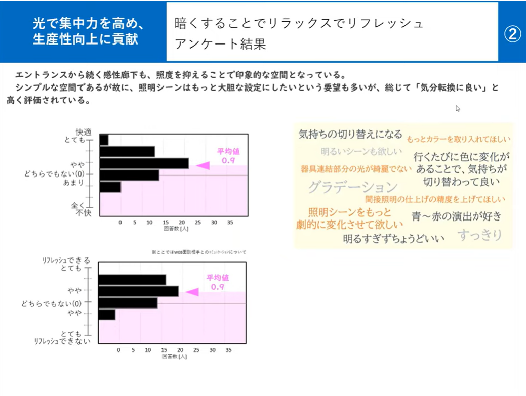 鈴木「これはその時のアンケートです。これも快適と不快、あとはリフレッシュできる、できないというアンケートを取っています。上は快適、不快というアンケートですけれども、大多数が快適という回答を得ています。下のグラフのリフレッシュできるというのも、半数以上がリフレッシュできてるという回答を得ています。また、右側には生の声が入ってますけども、60lxという照度でいうと低めの空間ですけども、明るすぎずちょうど良いとか、気持ちの切り替えになるとか、そういった狙いどおりの効果もありますが、ネガティブ評価としても、もっとカラーをして欲しいとか照明器具自体のハード的な要望であるとかいろいろありますけども、照明器具の狙いとしては狙い通り上手くいってるんじゃないかと言えます。」