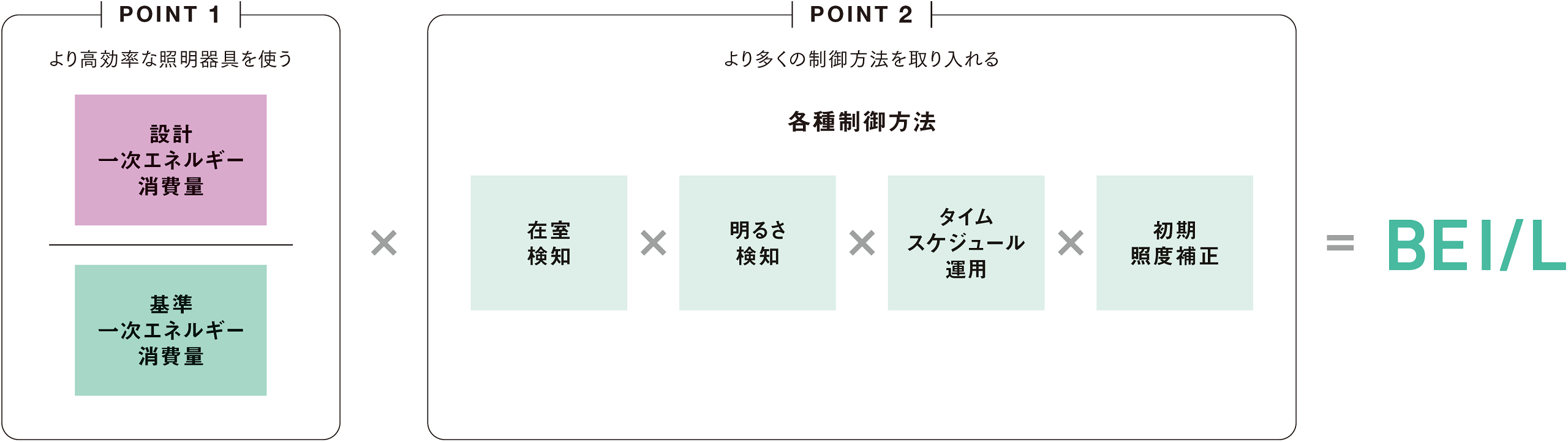 より高効率な照明器具を使用することに加え、より多くの制御方法を取り入れることでBEI/Lの値を下げることが可能となります。