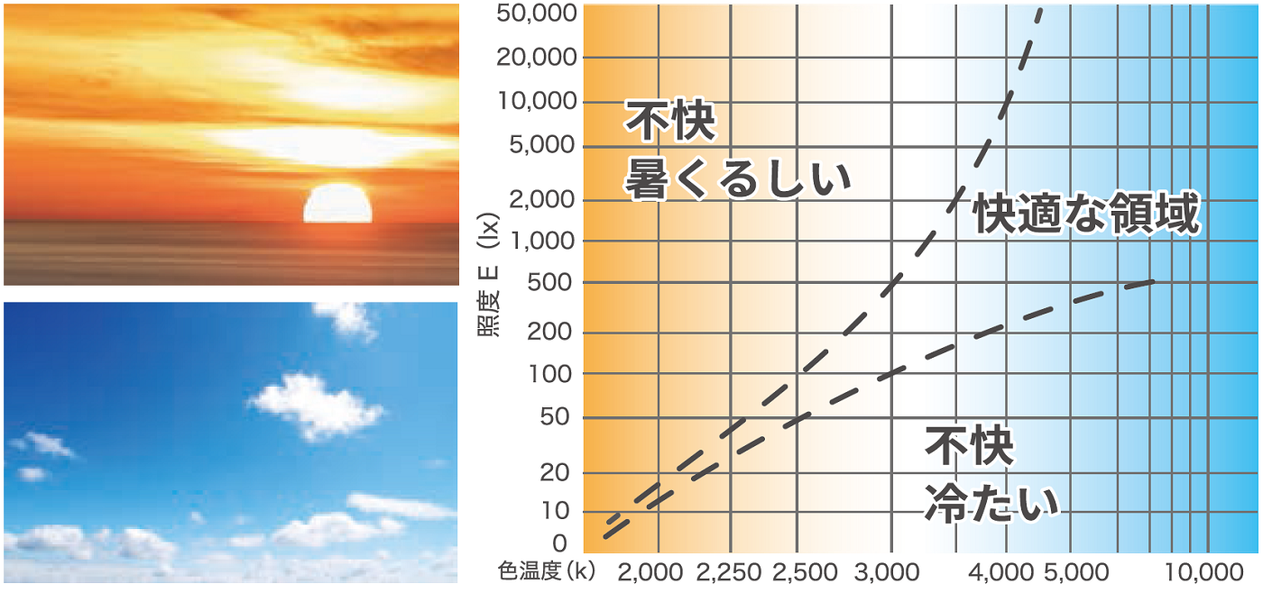 色温度と照度には「クルーゾフ効果」と呼ばれる関係があります。例えば色温度の低い光は、照度が低いと穏やかで暖かい印象になりますが、照度が高くなると暑苦しく不快に感じられることがあります。この関係性を踏まえ、低色温度時は照度を下げることで、快適な光環境とエネルギー削減を両立できます。
