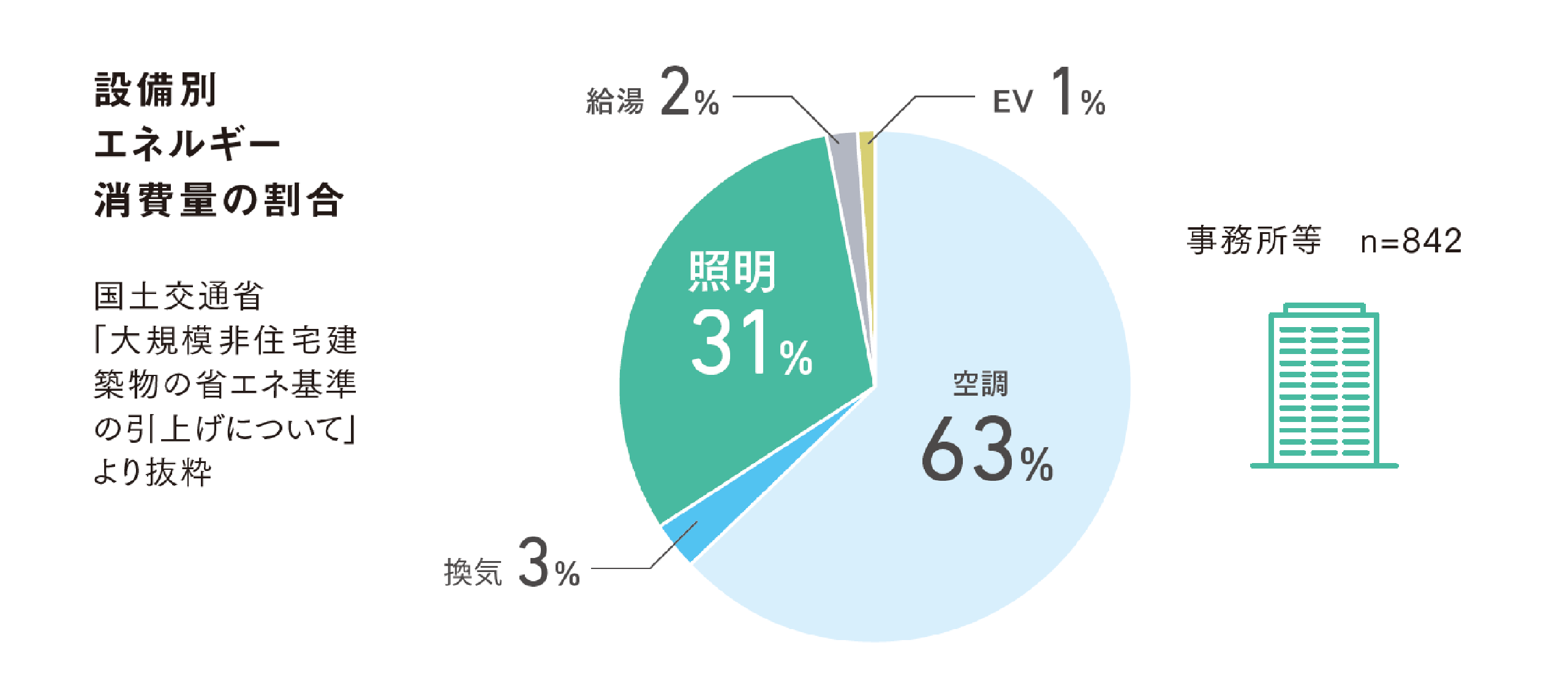 国土交通省による調べでは、事務所等の消費電力量のうち照明が占める割合は約31%。