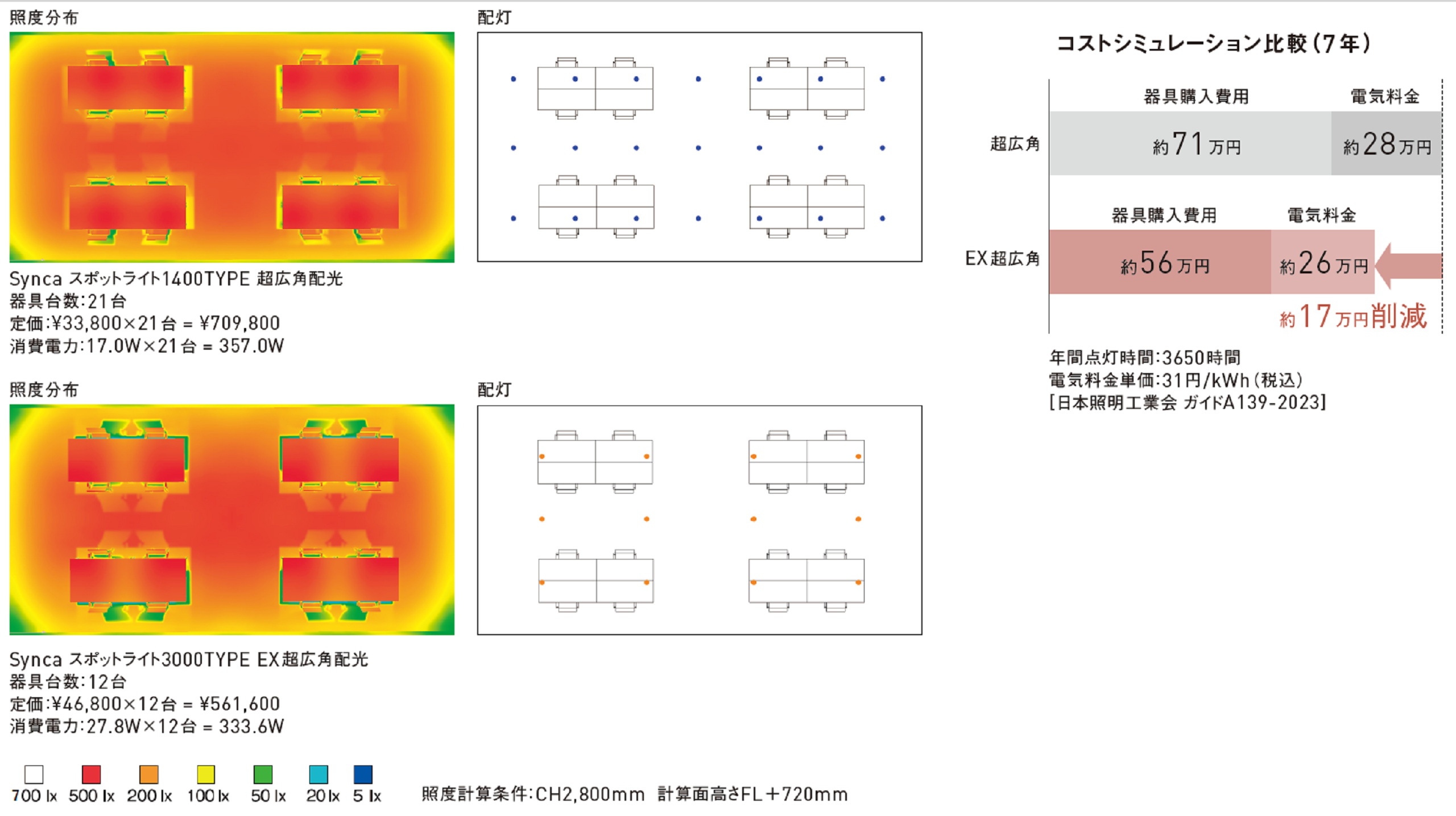 これにより器具台数を減らし、照明器具の導入費用を抑えることができるほか、トータルの消費電力も削減することができるため、ランニングコストの削減が可能となります。