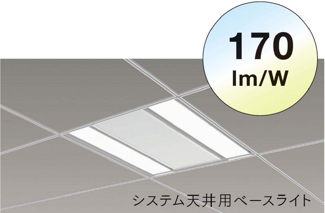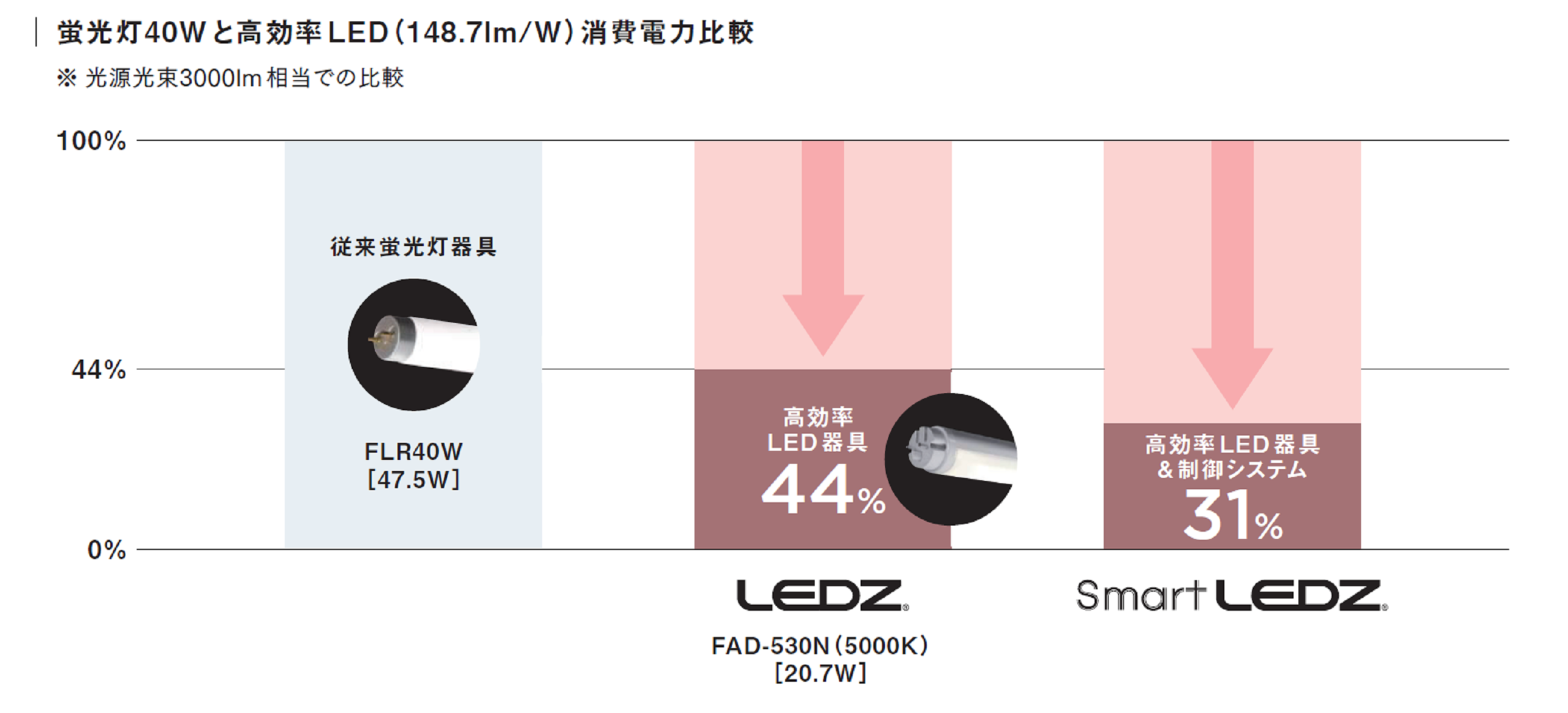 高効率LED 照明器具にすることで、蛍光灯と比較しておよそ半分の消費電力に削減することが可能。
