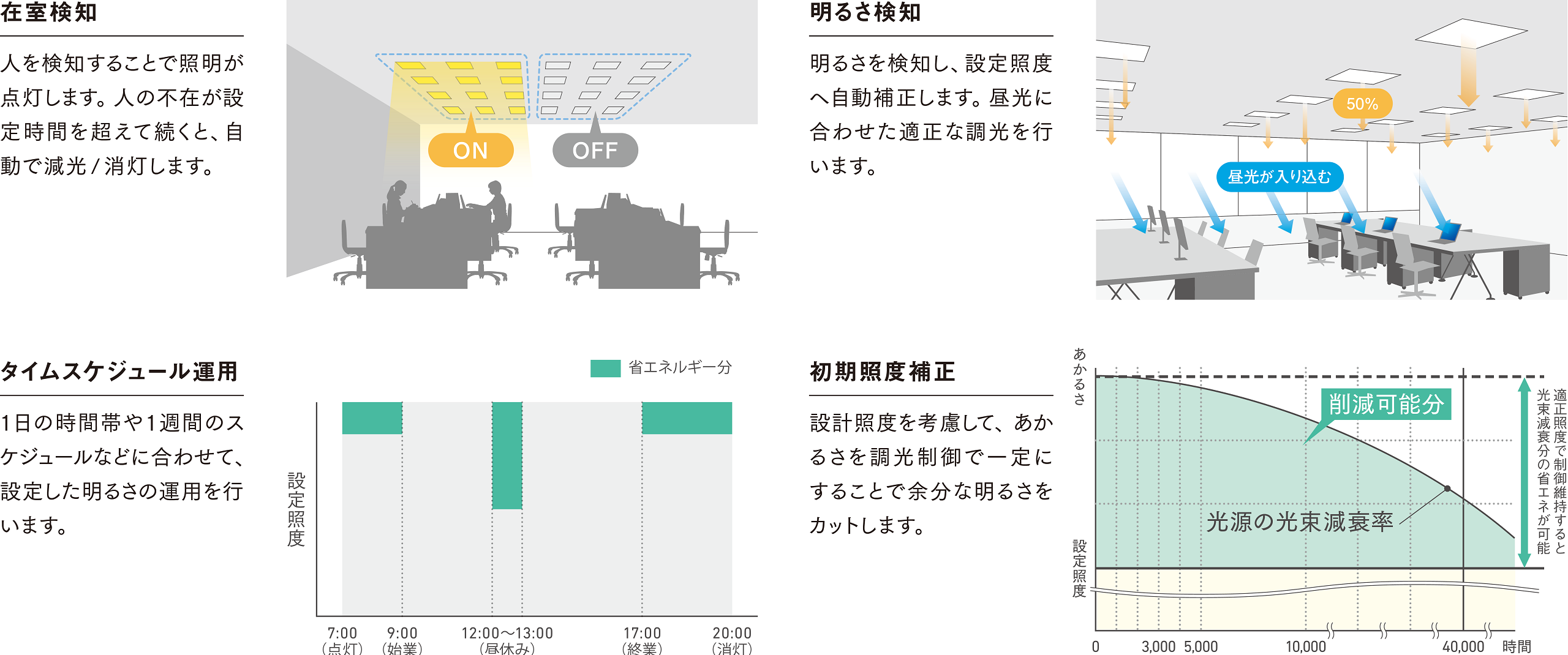さらに、照明を制御することで、より一層エネルギー削減効果を高めることができます。