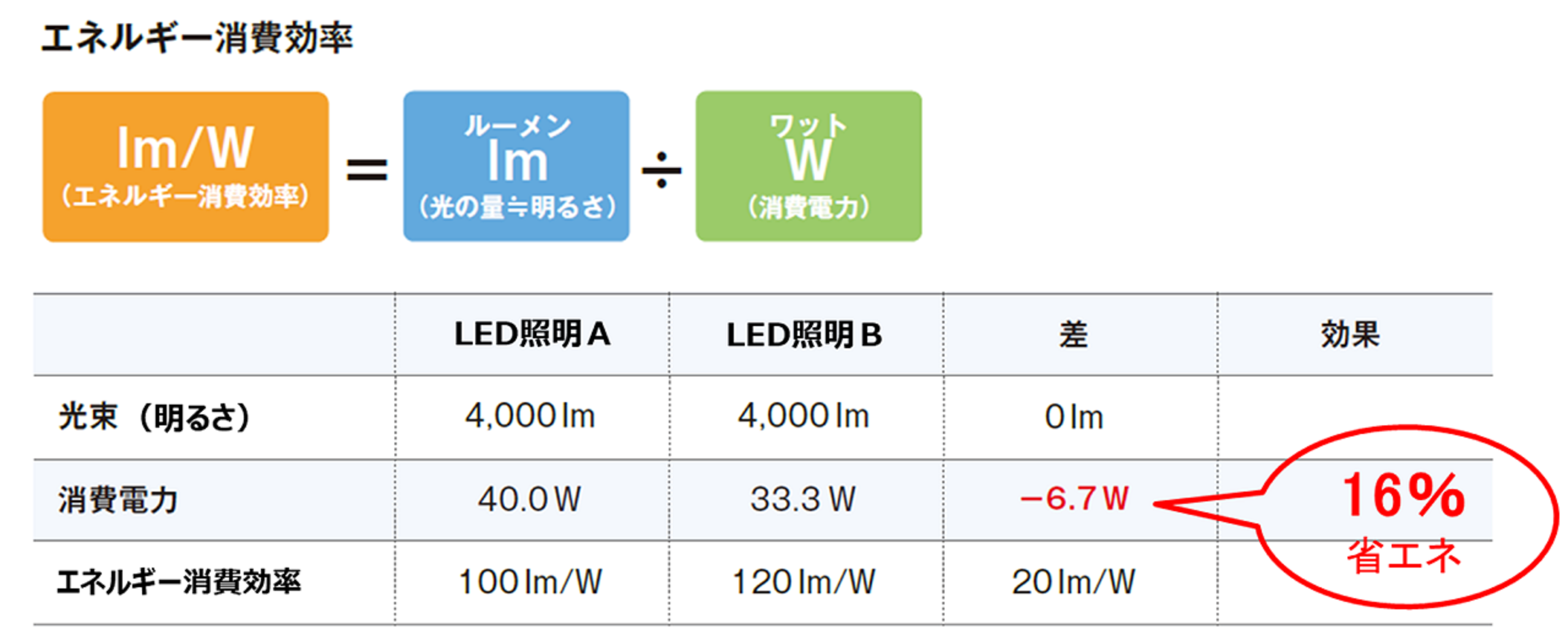 また(?)、エネルギー消費効率(lm/W)が高い方が、同じ光量(≒明るさ)を得るための消費電力が低くて済みます。
