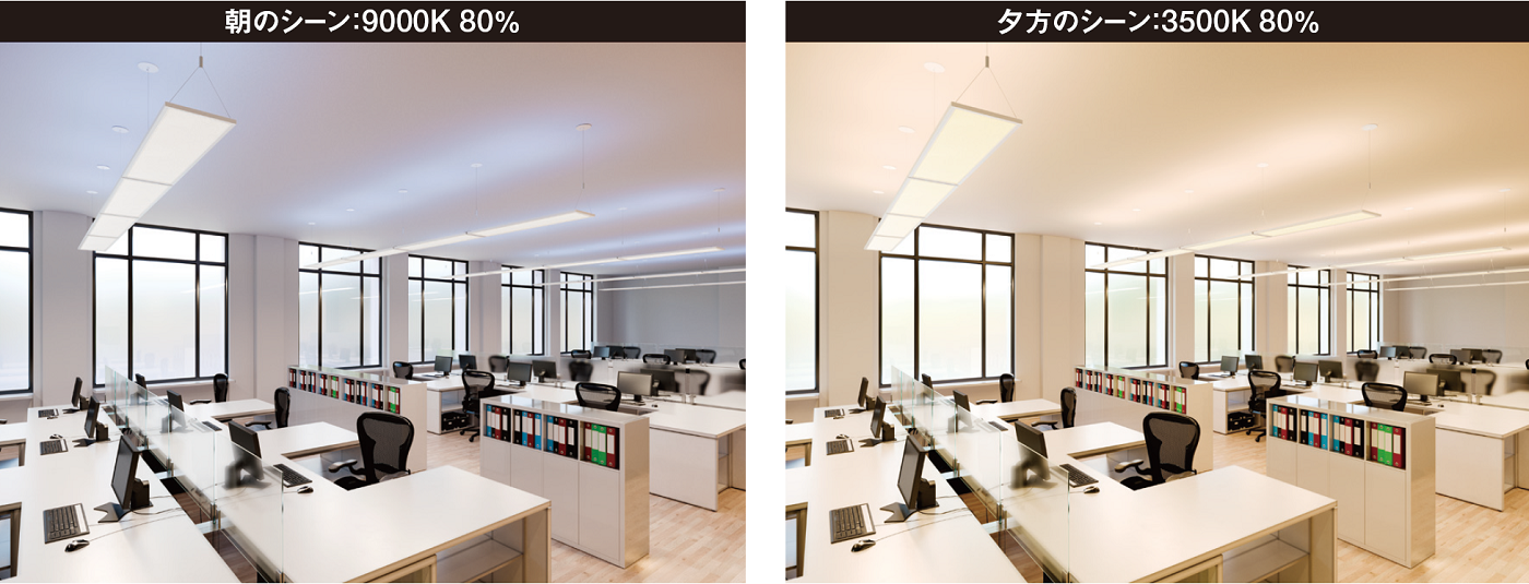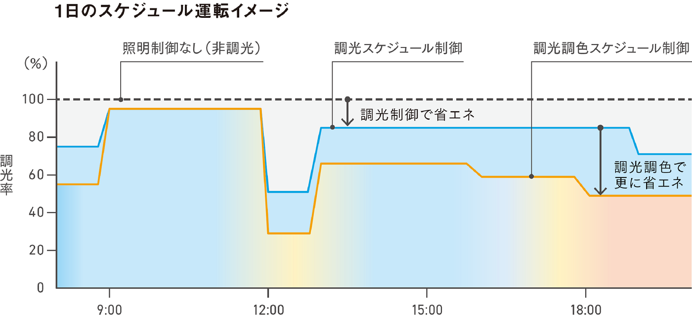 快適な色温度と明るさの関係性を保った運用により、調光のみの場合より高い省エネ効果が期待できます。