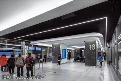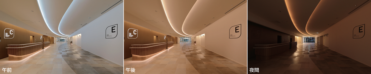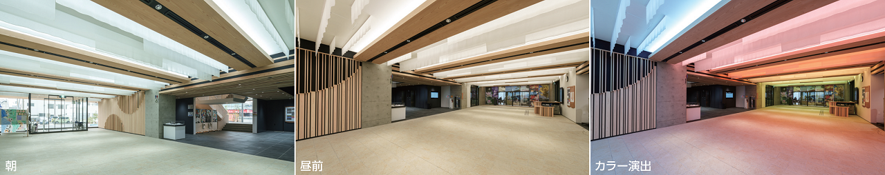 通常時の運用は屋外と室内をシームレス につなぐ中間地点としてのロビーに1日の光の流れを照明で表現。加えて、毎時約10分間、 5パターンの色が色彩豊かなみやこ姫の着物のように変化する。