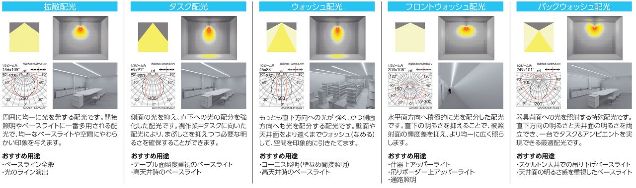 ・配光:拡散・レクタングル・フロントウォッシュ・バックウォッシュなど