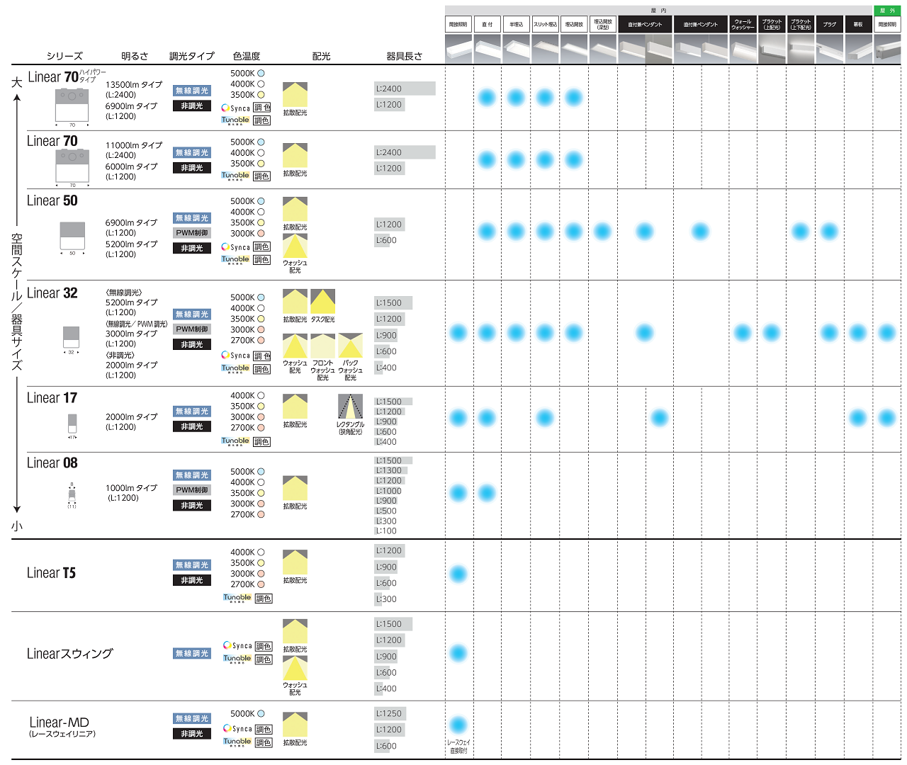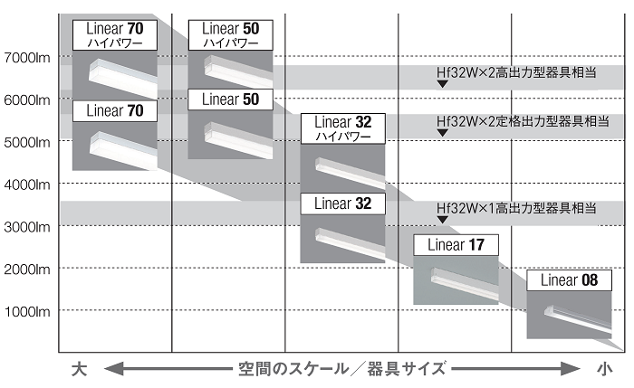 ・明るさ:13,500lm(リニア70)~1,000lm(リニア08)