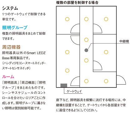 デバイスを追加することで、無線対応照明器具以外も無線制御システム「Smart LEDZ Base」で制御することが可能となります。