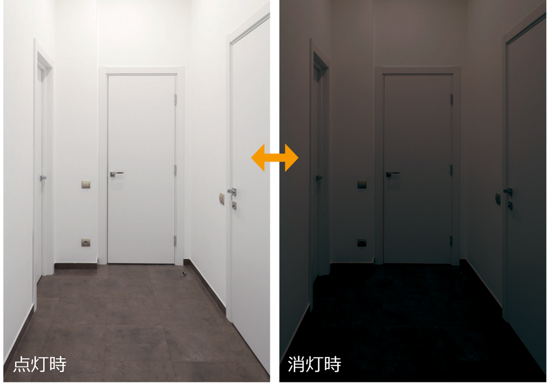 スマートセンサスイッチが人の通過を検知して照明を点灯。人がいないときは消灯しておくことで、省エネに貢献します。