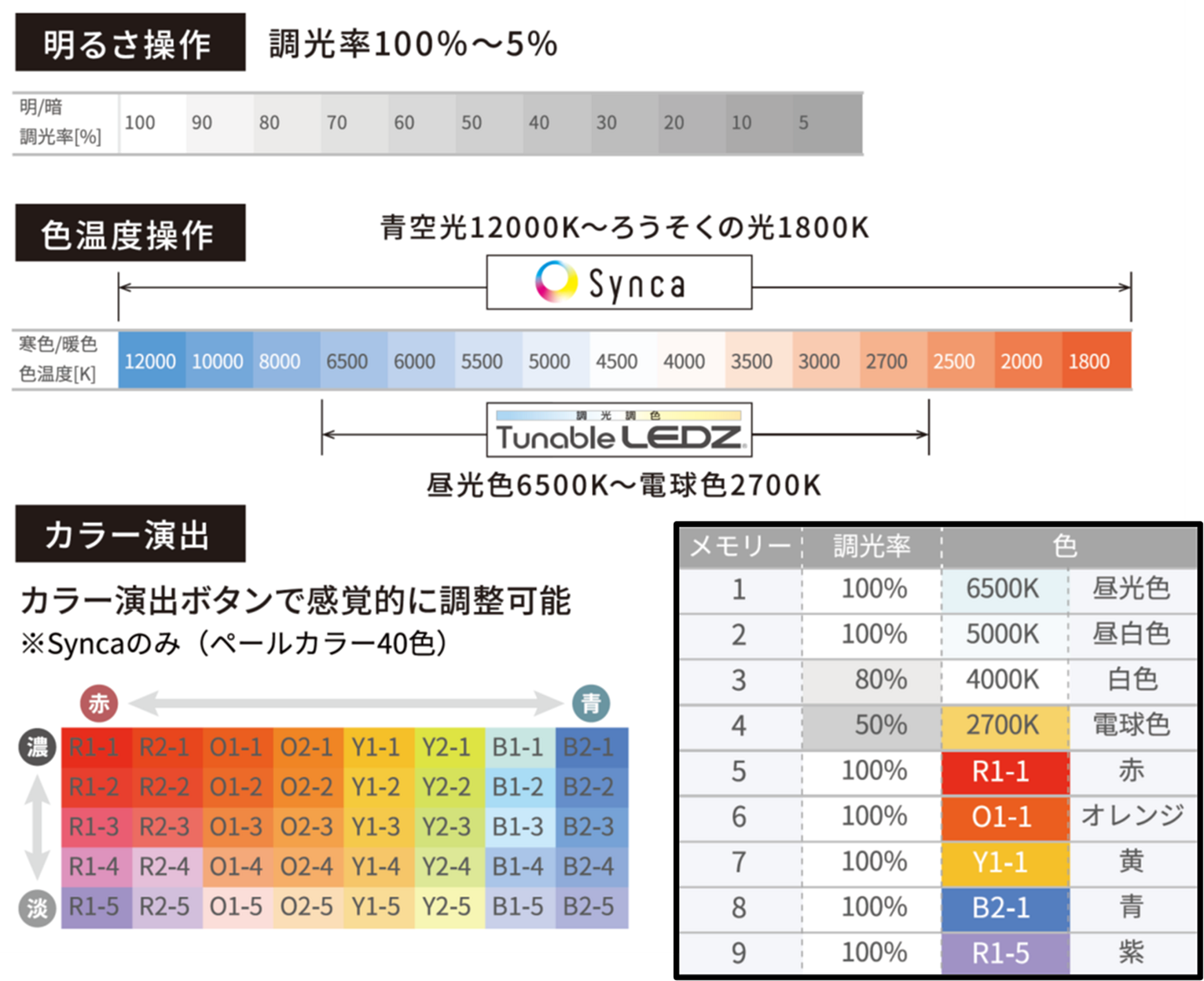 Syncaの場合:12000K~1800K、Tunable LEDZの場合:6500K~2700K