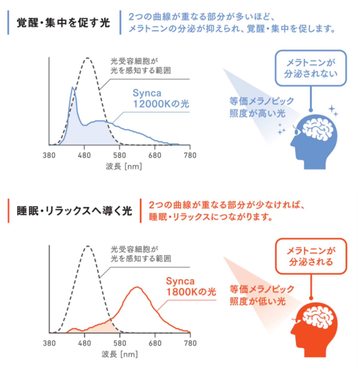 Syncaの高色温度の光はipRGCが受容する波長域に含まれる波長が多く、等価メラノピック照度が高くなります。覚醒を促し集中力を高めるためにより適した色温度です。