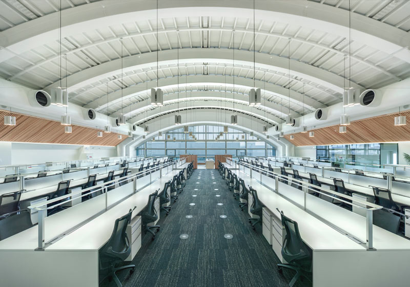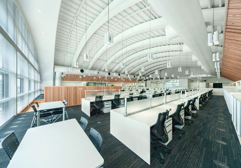 もと12mの天井高があった体育館の床を上げ事務室としての最適化を図った後、約8mの天井高となったヴォールト天井へLED上下配光ペンダントを新設し、アンビエント照明として机上面平均照度300lxを確保。白く塗装された天井面と壁面スリットの間接照明により、明るく柔らかな光がオフィスを包み込む。デスクと一体化したタスクライト(他社)により作業面照度は確保されている。