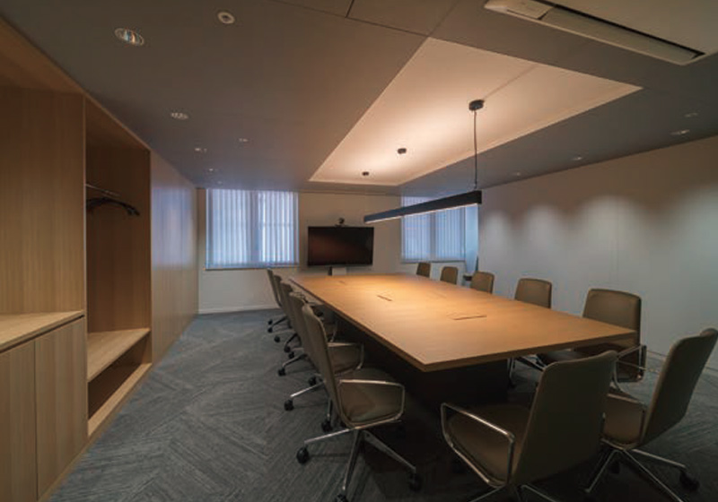1階は、改装前までは真ん中に大きな段差があって、使いづらい空間でした。そこで、あえて中央にボタニカルガーデンを設けて、その周りに丸テーブル、ハイテーブル、長机など、複数のタイプの打ち合わせ空間を配置しています。これにより、来るたびに違ったイメージを抱いてもらえることを意図しました。また、天井がCH=2,600mmと低いため、天井面を黒くしてアコースティックルーバの中に空調や照明器具を隠すことで、 天井や機器の存在感を弱めています。2階の会議スペースは、既存部との調和を考えながら、既存と同じ素材や仕上げを工夫しつつ、今までとは違った使い方をすることで、コントラストをつけすぎ ずに新鮮な雰囲気を演出。全体的には「木」を基調にした温かみのあるデザインで、和の雰囲気とモダンな印象を併せ持つハイグレードな空間に仕上げました。照明には、グレアレスダウンライトと間接照明を多用し、照明器具の存在を感じさせず、素材の色やテクスチャーを光によってシンプルに表現しています。色温度3500Kはプレゼン当初、施主側には不安の声も少しありましたが、実際の光の印象を体感して納得いただけました。