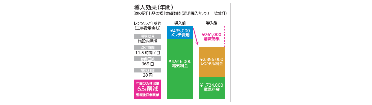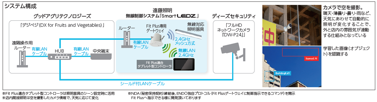 国道45号線沿いの道の駅「上品の郷」は、宮城県の道の駅では唯一、温泉保養施設があり、非日常の安らぎの空間と 日常の食に関するこだわりの農産物やエコファーマー認定に取り組む、地域の人はもちろん観光客の皆さんにも人気のスポットです。今回、竣工から20年近く経つこともあり、照明器具を蛍光灯からLED照明にレンタルという形で導入することとなりました。LEDに変えたことで電気代の削減を実現。当駅は天井が高く、蛍光灯を設置していた頃はランプ交換には足場を組む必要があり大変だったので、メンテナンスの心配や費用もなくなったことが大きいです。また、レンタルなので最新の照明器具に変更することも可能で、常により良い環境をお客様に提供できることが最大のメリットです。加えて良かった点として、グッドアグリテクノロジーズの『デジベジ』、ディーズセキュリティのフルHDネットワークカメラ「DW-P24」と遠藤照明の無線制御システム『Smart LEDZ』を連動させたことです。当駅ではAIカメラで外の空(天気環境)を撮影。時間の経過によって店内の照明が変化し、快適性と省エネの両立を図っています。たとえば、日中の晴れであれば店内スポットライトの調光率60% 間接照明●11-1、曇りであれば調光率50% ●4-1としています。お客様からは「明るくなった」「雰囲気が良くなった」「野菜などを購入する際に見やすく、選びやすくなった」等好評の声をいただいています。さらに良かった点は、屋外照明をリモコンで簡単に変更できるようになったことです。光を変えることでイベントやセールをお知らせできる等、新しい試みもできるようになりました。これからも道の駅の未知の可能性を追求し、野菜の色を認識して最適な照明に自動的に変化させたり、商品の売れ行きに応じて照明を変化させたりと、よりお客様に親しんでいただける場所を目指していきたいです。