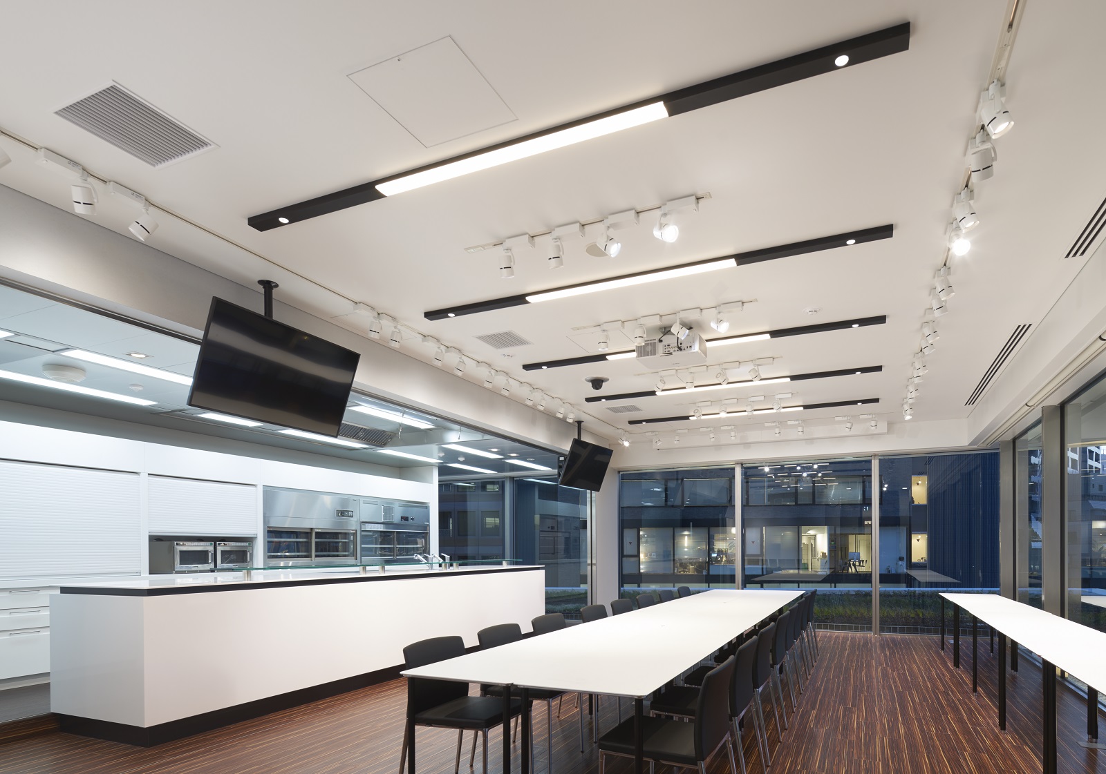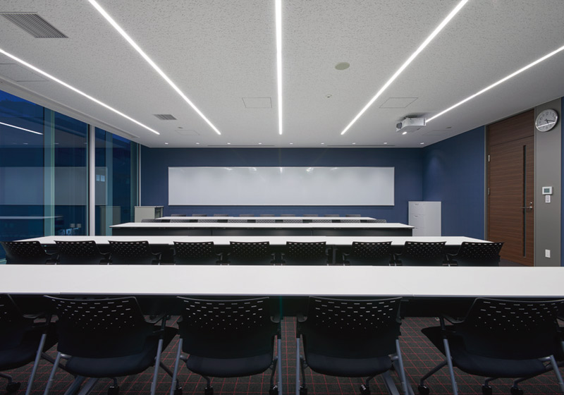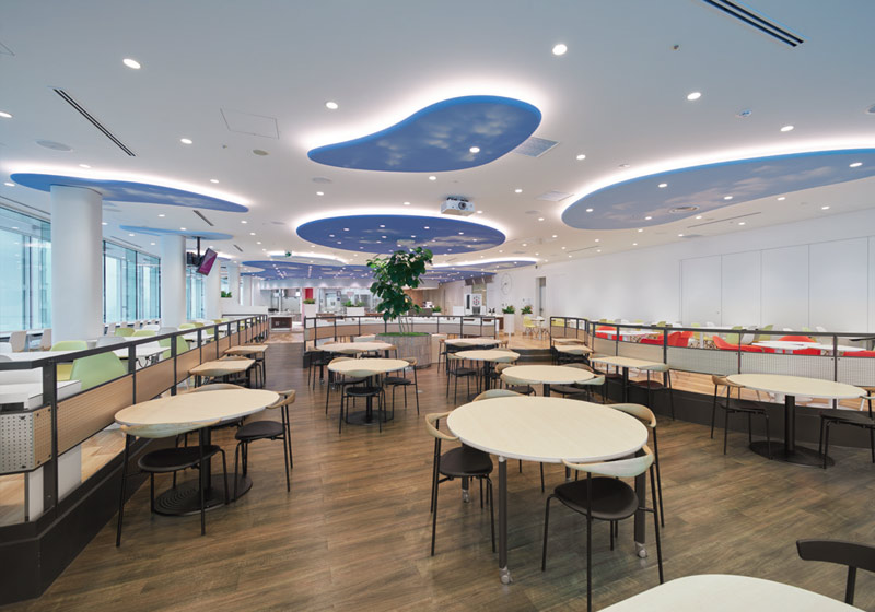 その設計の中で特に拘ったエリアが、プレゼンテーションルームです。専用のキッチンを設けて、その場で調理し、試食していただきながら商品やメニューをご提案する、いわばビジネス向け『3分クッキング』の実現です。お客様にご満足いただける商品提供として、味・食感・そして見え方の大切さに重きを置き、より魅力的に表現できる光環境を追求しました。マヨネーズのクリーム色を味わい深く、サラダをよりフレッシュに、加工食品のパッケージをより鮮やかに…光を変えることで、こんなに商品が映えるとは。遠藤照明のショールームで初めて体験した時、思わず驚きの声をあげたくらいです。