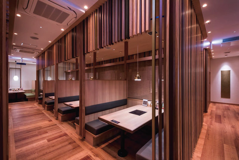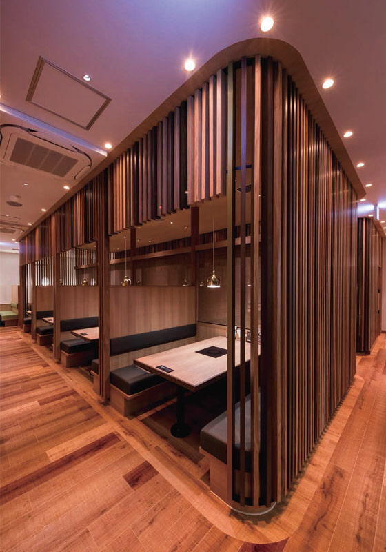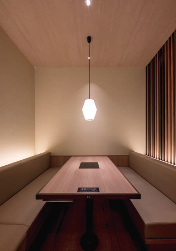 そのような「くつろぎ」をかなえるため、当店は照明においていくつかの取り組みを実施した。まず、店内全体を、入り口・テーブル・通路・壁面格子・半個室内間接、トイレに至るまで、約14のグループに分け、細かく調光率を設定。幸せな“団らん”をつくりだすという店舗コンセプトは、照明の細部にまでとことんこだわりぬく姿勢に表れている。それは、照明器具を1台1台制御・グループ調整できる無線調光システム「Smart LEDZ」だからこそ実現できたことである。このような細かい調光率のこだわりに加え、木の格子部分や半個室の間接照明など、特に人の目を引き、店内の印象に大きく影響を与える立面部分には調光調色器具を採用。自在に変更できる色温度と照度(調光率)の検討を重ね、求めるイメージへの調整を繰り返し、最適な明るさバランス・色温度へと決定した。実際に現場で、その箇所その箇所の内装材の色・表情が照明で変わる様子を見ながら調整し、納得の空間を実現した。特に、半個室の象徴となる壁面の格子はランダムに木の色目が変わっており、その格子がきれいに見えるベストな色温度と明るさといった、拘りの設定となっている。「上質なゆとりある空間で、夕食を晩餐に」を掲げる「きんのぶた」で、今夜も適材適所の照明がおいしさとくつろぎを引き立てている。