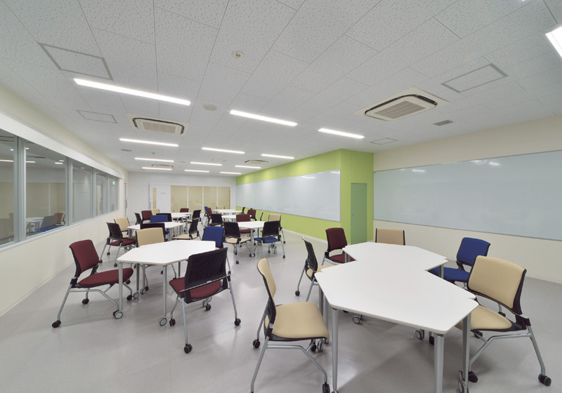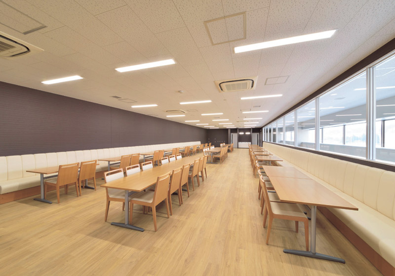 東北工場では食品に直接触れる容器を製造しているため、場内は厳しい衛生管理が求められた。その条件を満たすためにLED照明器具(特注品:大成建設様共同開発)にもいくつかの改良を加えている。特に製作にあたっては、①埃だまりが少ない理想的な形状②高気密③既製品LEDユニット使用による高汎用性の3点を追求。明るさについても作業面照度500lx(CH5,700mm)を確保しており、衛生的かつ安全な作業環境を実現している。また、ミーティングルームや食堂などにも、製造室と同じLEDユニットを展開することで、施設全体のメンテナンスのしやすさに配慮している。その他に、廊下ダウンライトに人感センサーによるON・OFF機能を活用するなど、ムリムダのないエネルギー対策が実施されている。