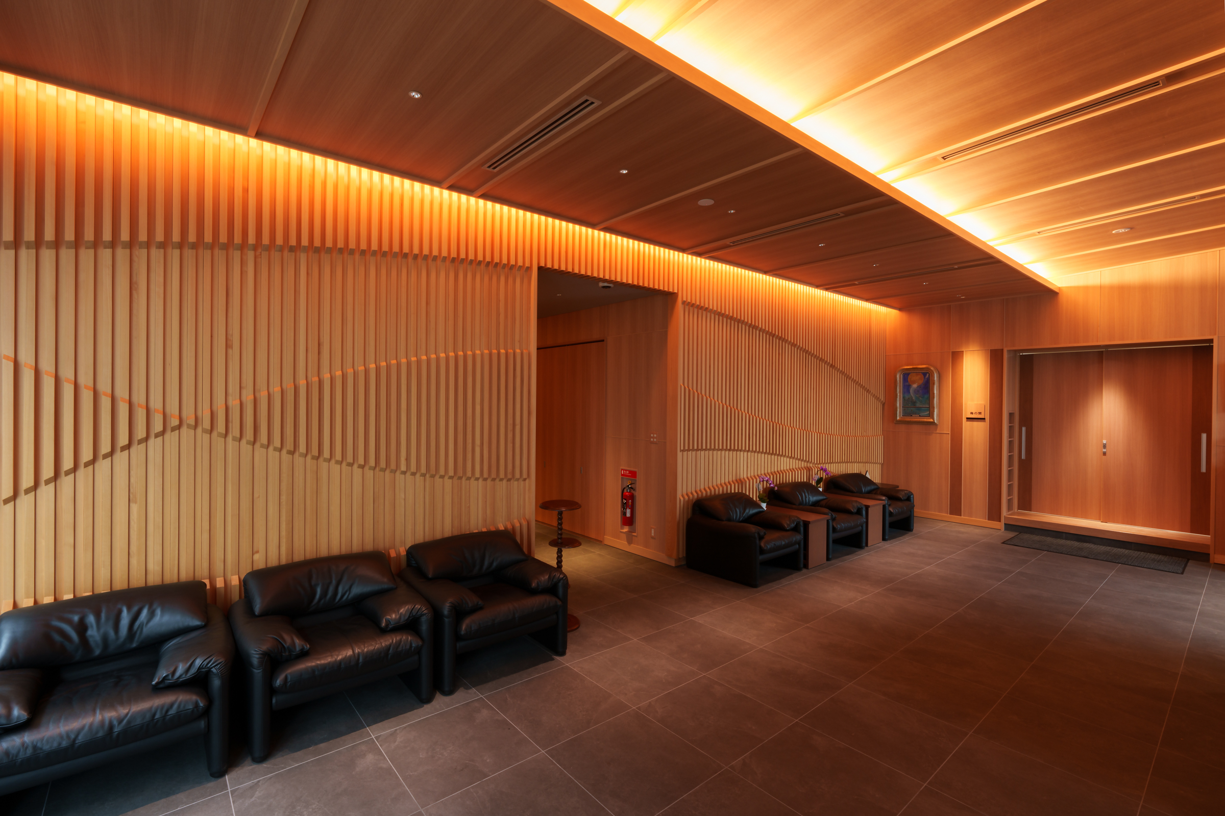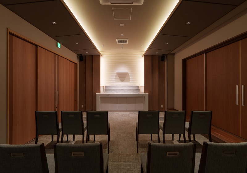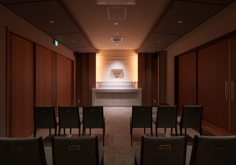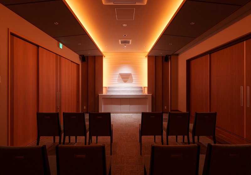 家族葬規模の新築葬儀場『光輪閣内浜別館』は、高級ホテルをコンセプトに設計されており、上質で落ち着いた空間づくりが追求されている。照明計画においてもその思想を反映し、照明の主張を抑えるためにグレアレス設計を採用。光源が直接視界に入らないよう配慮することで、空間に自然と溶け込むやわらかな明かりを実現した。運用面では、式の進行と照明制御を一人のスタッフが担うスタイルを導入。従来のスライダーによる複雑な調光操作を廃し、スマートフォンにダウンロードしたSmart LEDZ Baseアプリによって、簡易かつ直感的な操作を可能とした。照明システムはエントランスにSmart LEDZ Fitを、式場(二部屋)にはSmart LEDZ Baseを導入し、空間ごとに最適なライティングを提供している。