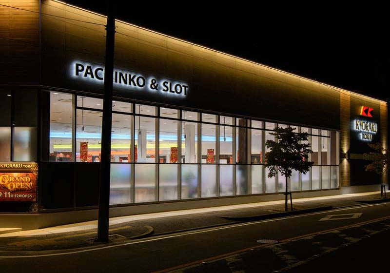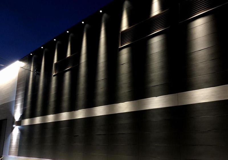 ファサード面のライトアップは、黒い外壁の上部に電球色のラインサインボード照明を並べてすっきりとしたラインを作り、サイド壁面は狭角のスポットでストライプ状の光を演出している。シンプルだが意匠的なライティングでお施主様や関係者の方々にも大変気に入っていただいている。