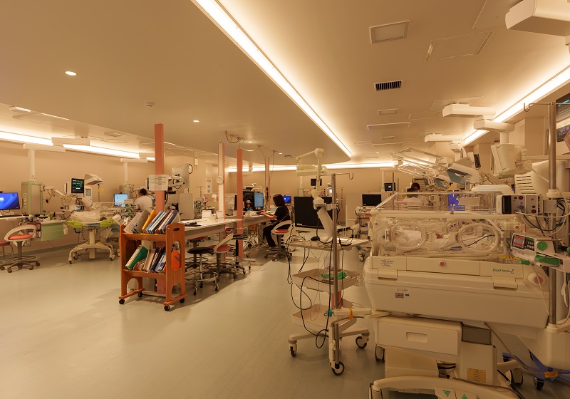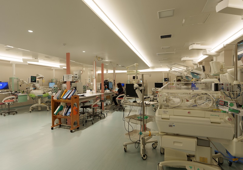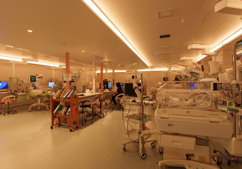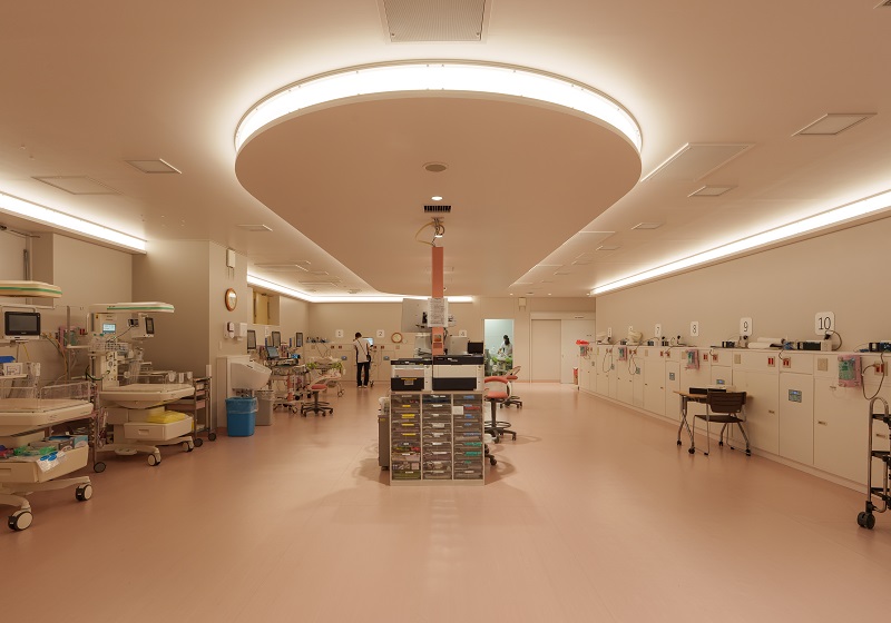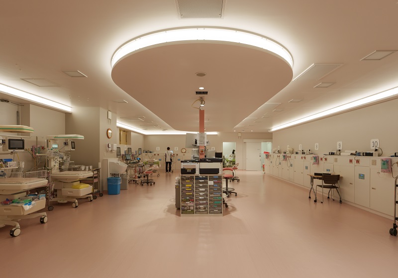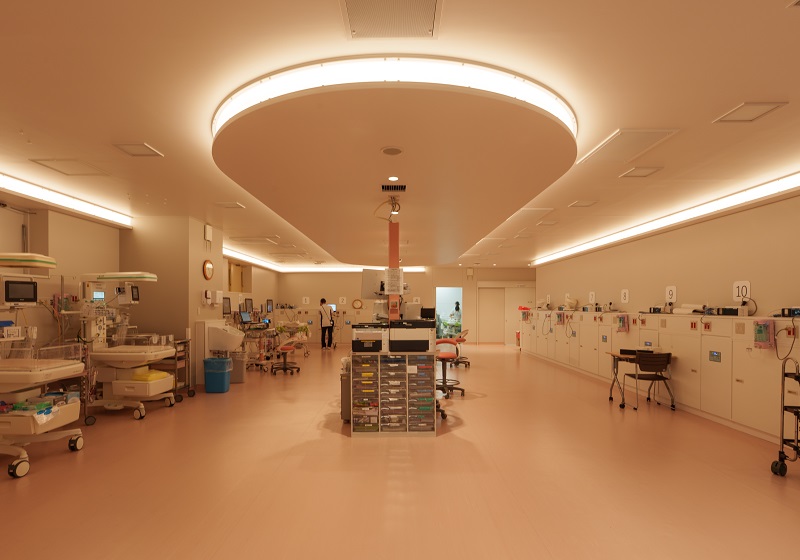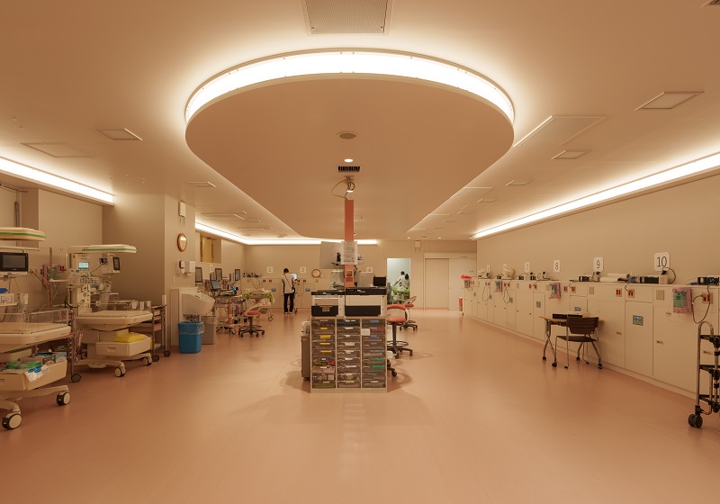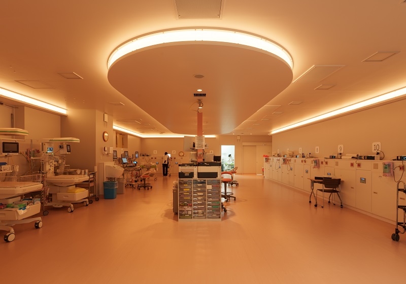 NICUにおける間接照明は非常に高い清浄度が求められるため、建築化照明の開口部にはアクリルカバーを設置。埃だまりを完全に防ぐディテールにより、感染症対策としての機能美と、メンテナンスの容易さを実現した。