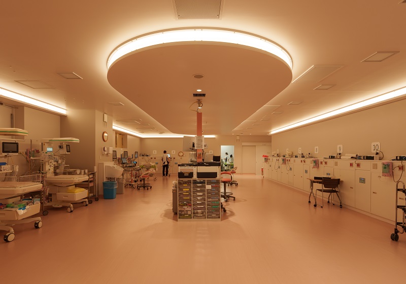 地域医療を支える武蔵野赤十字病院において、特に高度な環境制御が求められるNICU(新生児集中治療室)・GCU(回復治療室)および講堂に、次世代調光調色『Synca』が採用された。