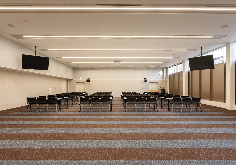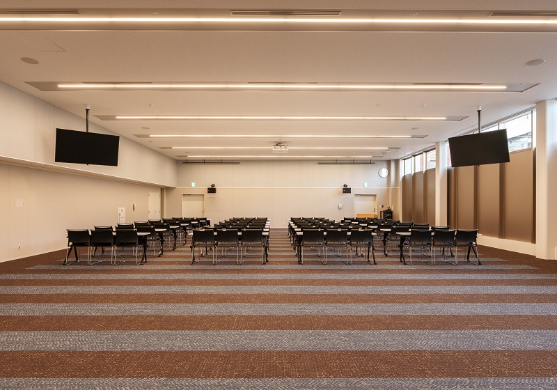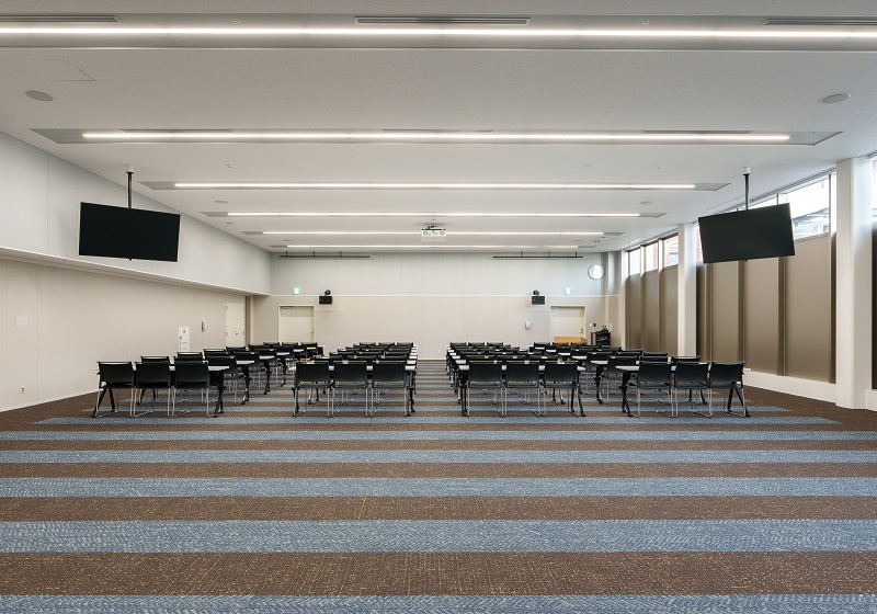 緊急処置の際には、各ベッド上のスクエアベースライトが5000K・100%で点灯し、瞬時に医療行為へ移行可能。また、講堂においても同シリーズを導入し、講習や催し等のシーンに応じた最適な光環境を提供している。