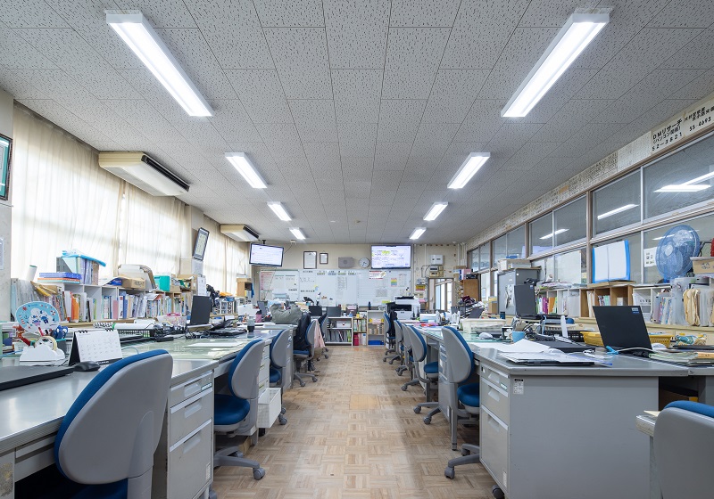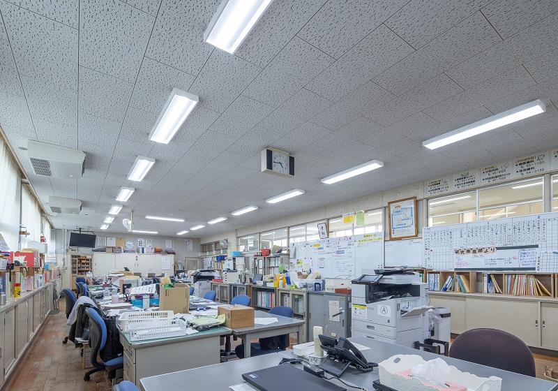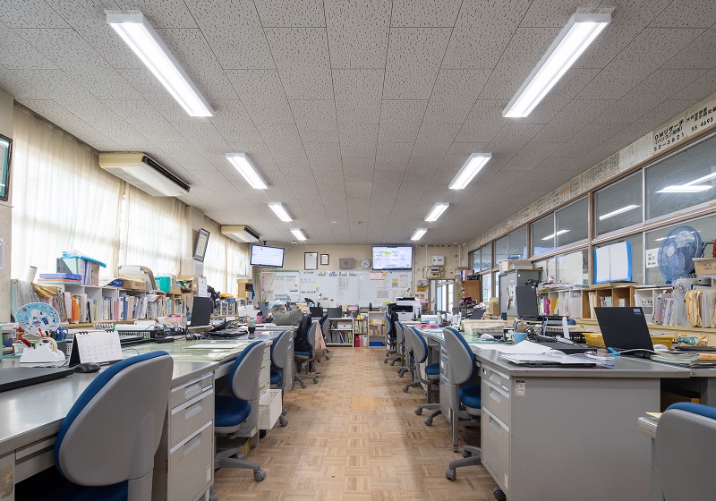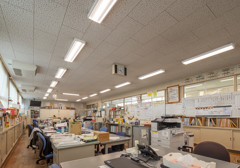 当初、本事業は老朽化した照明設備の更新と省エネ化を主目的とした、標準的なLED化工事として計画・設計を進めていた。そのような中、遠藤照明から「サーカディアンリズム照明」を提案。特に、多忙な校長と教職員の心身の健康やストレス軽減に貢献するというエビデンスに基づいた提案は、教育委員会として非常に興味深く、これからの学校施設が目指すべき姿の一つであると認識。最も大きな導入の決め手となったのは、教職員の健康に貢献するという高い付加価値がありながら、従来の公共施設向け標準品と比較して、価格差がほとんど無かった点。「これほど面白い使い方(健康価値の創出)ができるのに、価格がほぼ変わらないのであれば、ぜひ採用すべきだ」という意見が担当課内で一致し、採用を決定。設計業務は既に発注済みだったが、提案内容の優位性を鑑み仕様の変更を進めた。導入にあたっては、無線調光システムの複雑な操作性やコスト増が懸念されたが、「各校タブレット1台」という非常にシンプルな運用方法で、管理の負担やコストを抑えながら、先進的なシステムを導入することができた。