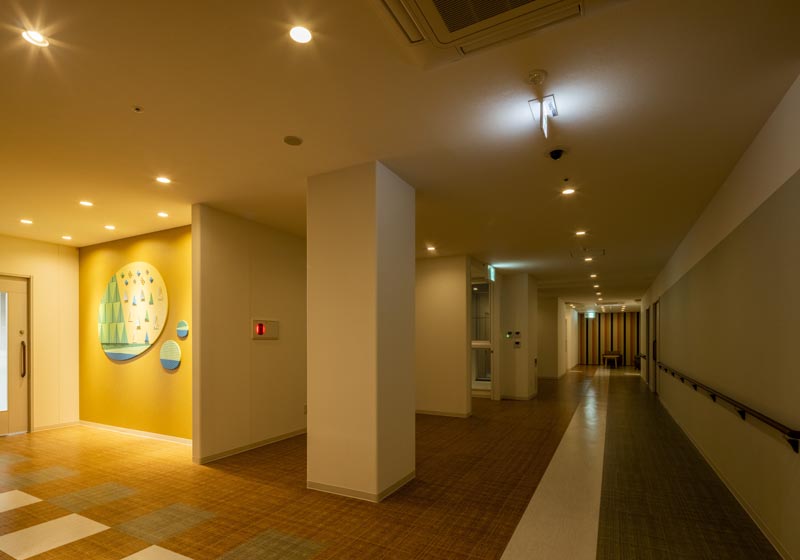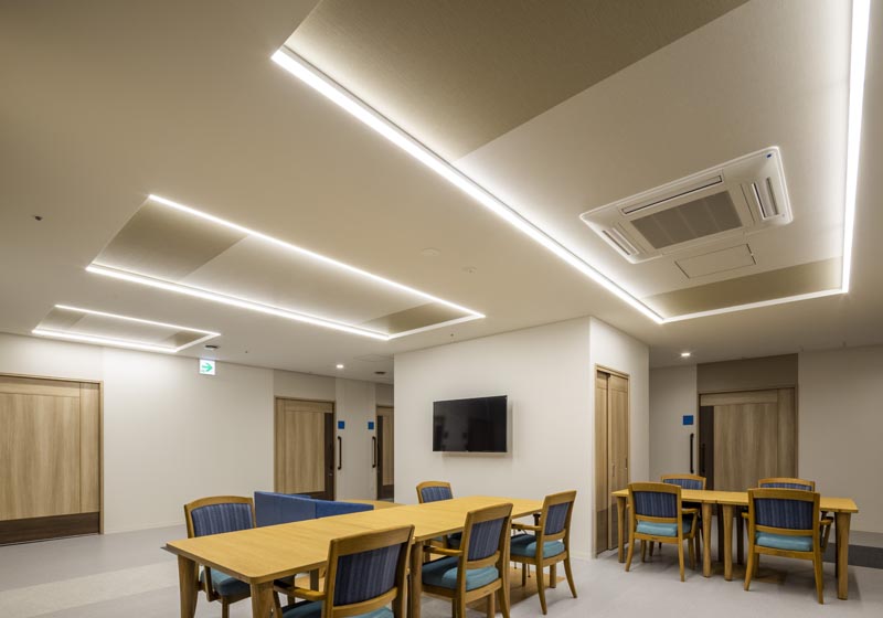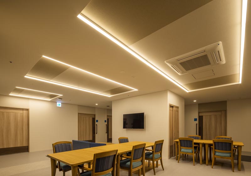 当初共同スペースはダウンライトだけでしたが、年配の方々に配慮し調光調色のライン照明にして空間の視認性を高め、1日の調色調光スケジュールは使用頻度の高い時間帯は調光率100%で早朝は4000K~5000K,昼は4000K、午後は3500K、睡眠を促す時間(20:00~21:00)は調光率60%で2700K,夜間は柱や壁面のみ明るくして夜間歩行の安全性を維持する設定にしています。
