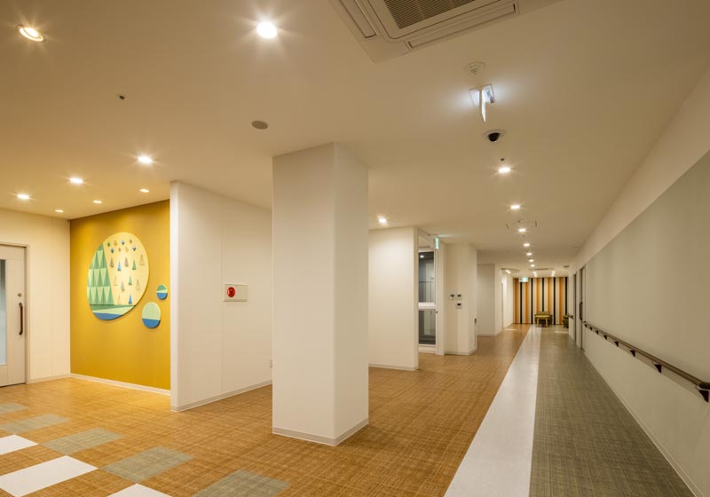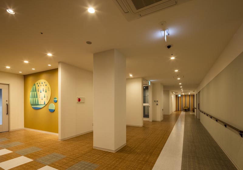札幌市内にある4層の全室個室ユニット型の特別養護老人ホームです。1~3階はキッチン・浴室等の共用スペースを中心に居室が囲み、4階はラウンジやテラスがあります。
