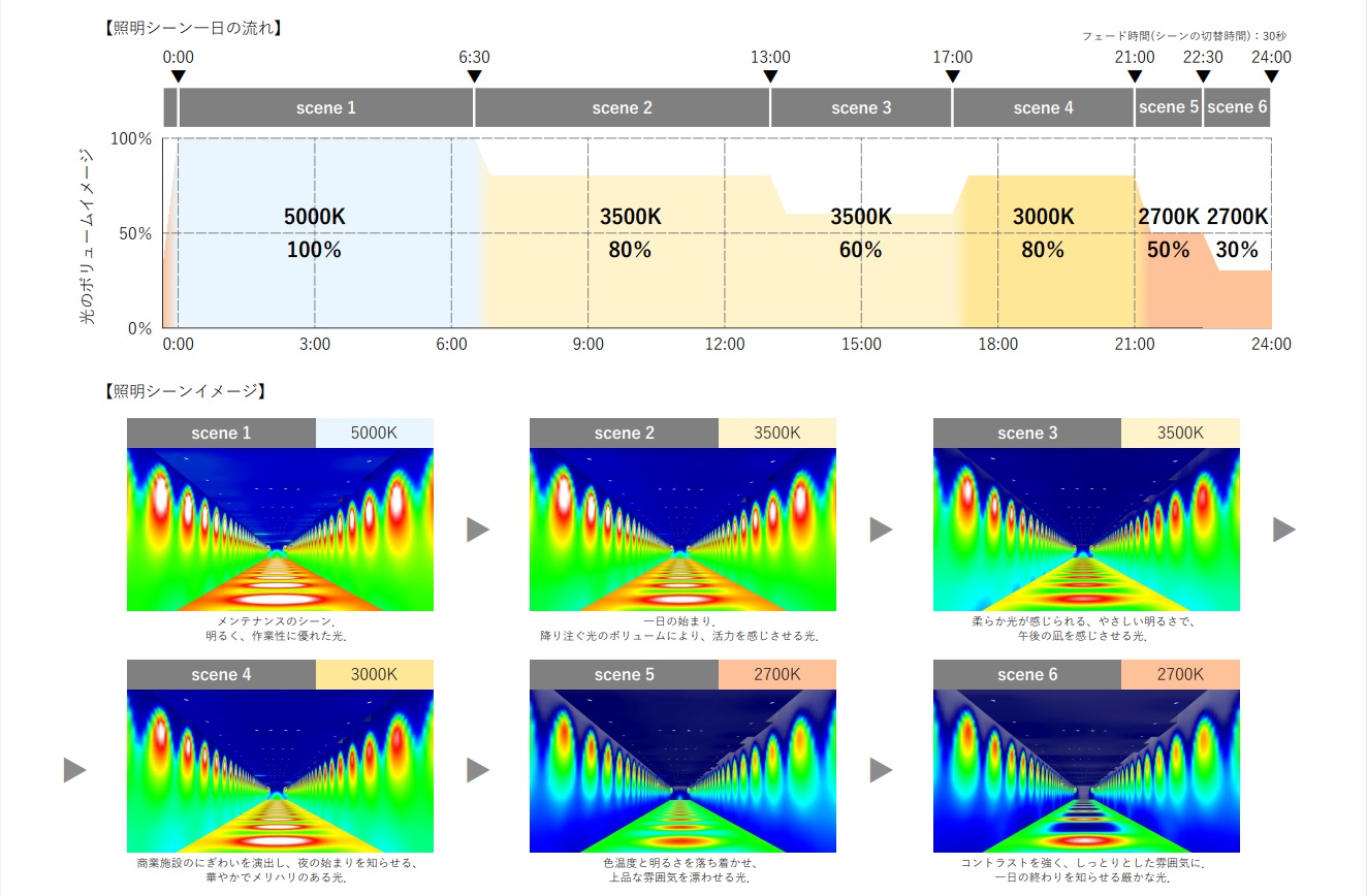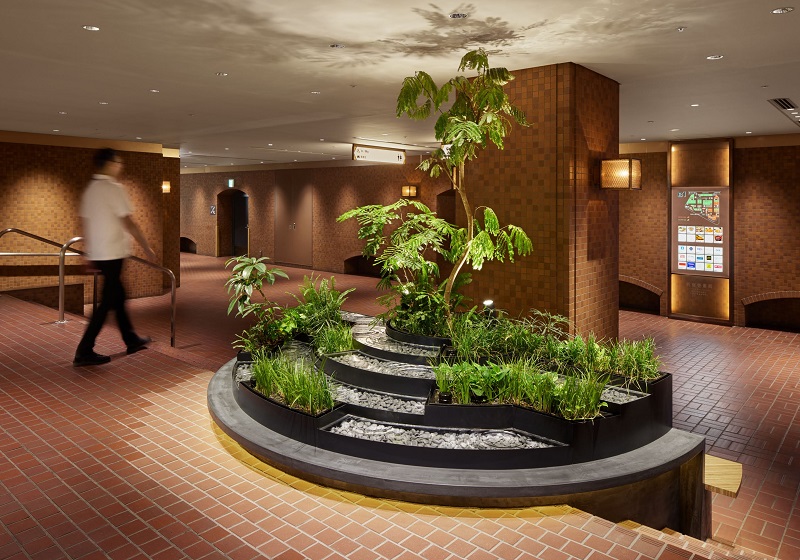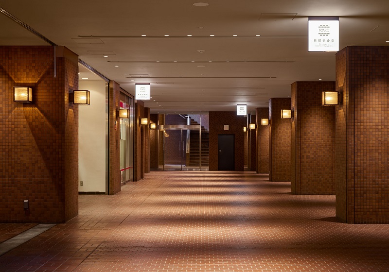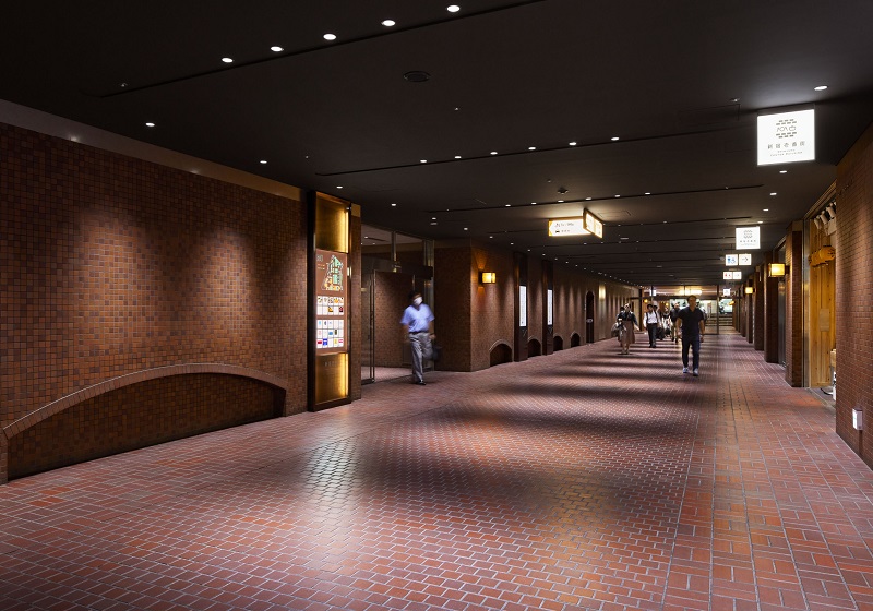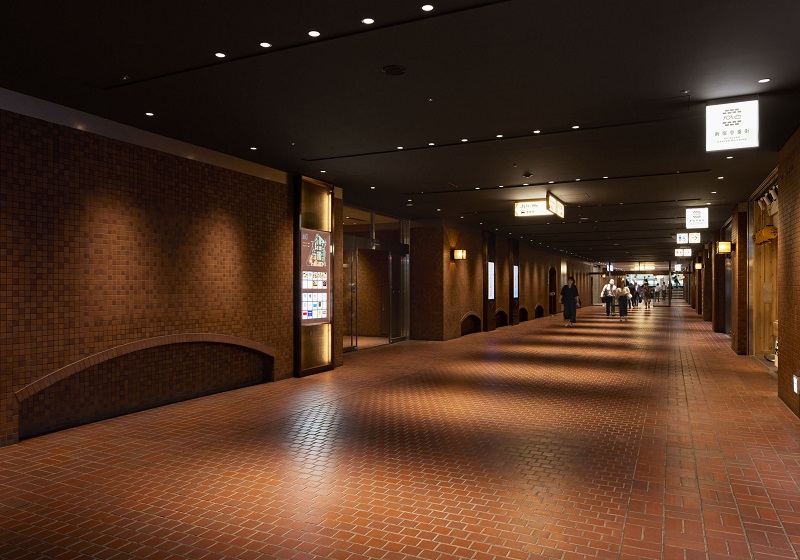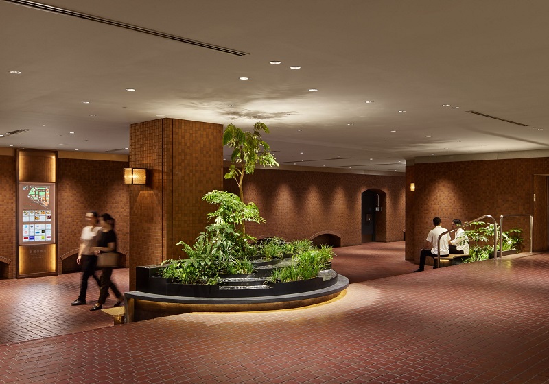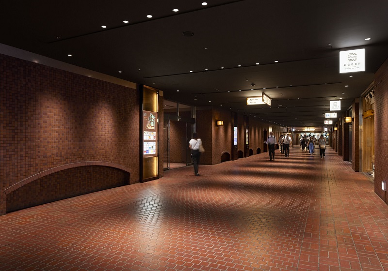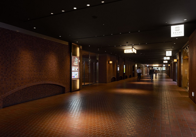 VIP車寄せの植栽エリアには、『Synca』を導入。日中はサーカディアンリズムを再現しつつ、夜間には植物育成に適した光を提供することで、地下空間でありながら自然の息吹を感じられるバイオフィリックデザインを実現。さらに、グレアを抑えたダウンライトを採用することで、快適で上質な空間を創出している。また廊下ブラケットは既存器具(管球タイプ)の本体を流用し、フェラメント型LEDランプ(無線調光)に交換しリニューアルしている。このリニューアルにより、新宿センタービル地下レストラン街は、時間とともに変化する光を感じられる洗練された空間を提供している。