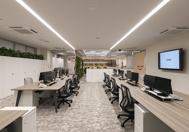 エビデンスに基づく光の効果と、「感動」「快適」「健康」「コミュニケーション」といった体験(User Experience)を追求し発信するライブオフィス“Synca U/X Lab CROSS OSAKA”。3階は、自然な光、新たな発想創出、働きやすさ、健康など、光の可能性を拡張するオフィスがコンセプト。窓がひとつもないフロアの中『Synca リニア32』によるトップライトがまるで本物の自然光が差し込んでいるかのような演出を実施。1日の時間軸で、朝・昼・夕方・夜と光が移り変わり、サーカディアンリズムを整え、人の健康に寄り添う光環境を提供している。トップライトは無線調光システム『Smart LEDZ』により、夕方の空のようなグラデーションも表現可能。より自然に近い光環境を目指している。7階のコンセプトは、経済性と快適性を追求するライブオフィス。『Synca リニア50』により、執務室の明るさはしっかりと確保しつつ、1日の時間軸の変化や業務スケジュールと連動した光の移り変わりにより、デスクワーカーにとって効率的で快適な光環境を提供するとともに、色温度と照度の最適化によるエネルギー削減も同時に実現している。さらに、リチャージゾーンでは、レースウェイに直接施工することが可能な『Synca リニア- MD(レースウェイリニア)』を採用。例えば、夏は涼しげな青系の間接照明、冬は温かみのあるオレンジ系の間接照明を照射するなど、間接照明のやわらかな光を時間と季節に応じて変化させている。遠藤照明ショールーム兼ライブオフィスの最大面積を誇り、豊富な展示パターンで様々なシチュエーションを体感できる空間となっている。